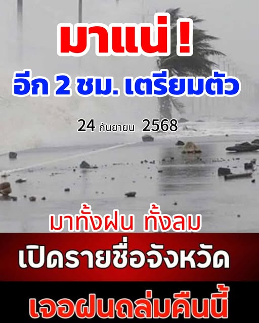 24 กันยายน 2568 พยากรณ์อากาศ 24 ชั่วโมงข้างหน้า ภาคตะวันออกเฉียงเหนือและภาคตะวันออก มีฝนตกหนักถึงหนักมากบางแห่ง ส่วนภาคเหนือ และภาคกลางมีฝนตกหนักบางพื้นที่ โดยเฉพาะบริเวณจังหวัดนครพนม มุกดาหาร ยโสธร อำนาจเจริญ อุบลราชธานี จันทบุรี และตราด ส่วนภาคใต้มีฝนฟ้าคะนองบางแห่ง ขอให้ประชาชนบริเวณประเทศไทยตอนบนระวังอันตรายจากฝนตกหนักถึงหนักมากและฝนที่ตกสะสม