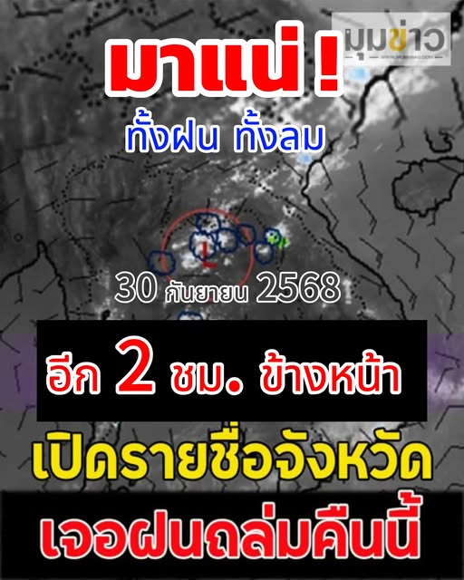30 กันยายน 2568 พยากรณ์อากาศ 24 ชั่วโมงข้างหน้า ประเทศไทยมีฝนตกหนักบางแห่ง โดยเฉพาะบริเวณจังหวัดแม่ฮ่องสอน เชียงใหม่ เชียงราย ลำพูน ลำปาง พะเยา น่าน แพร่ อุตรดิตถ์ และสุโขทัย